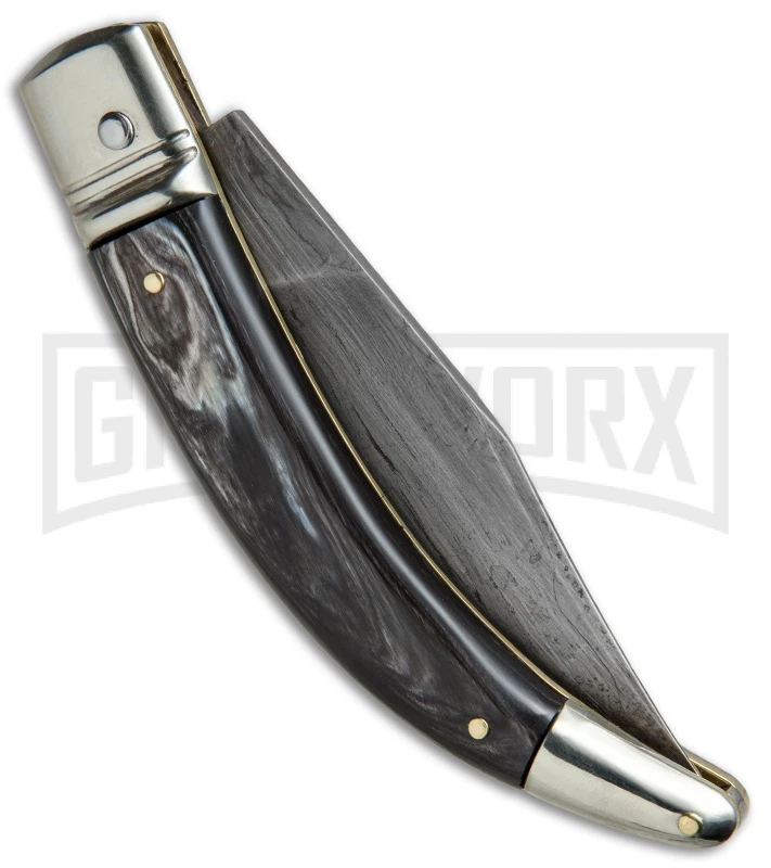 Offering a unique and lovely design, the AGA Diana Leverlock stiletto is a piece worthy of any Italian collection. This knife features a Damascus steel clip point blade and includes an “A.G.A. Campolin – Maniago Italy” collector stamp on the tang. Dark Horn scales add a touch of tradition to this knife, as do the brass liners and pins. The knife also has nickel silver bolsters and buttons and a classic Diana curved design. To close the blade, simply push down on the lever. A gorgeous piece with all the attention to detail collectors are looking for.